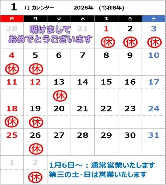 1月の営業日カレンダーです‼️